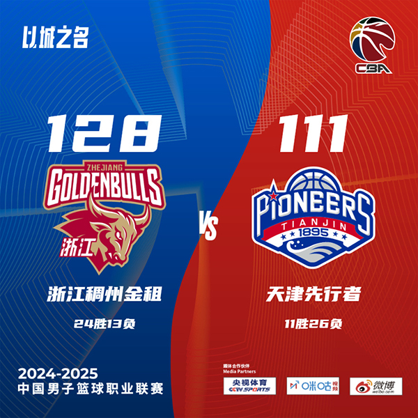 24直播网讯北京时间3月8日讯 CBA常规赛,浙江主场迎战天津。浙江23胜13负排联赛第9,天津11胜25负排第15。比赛开始,双方开场大打对攻,大卫-詹姆斯高效发挥,吴前连中三分给出回应,次节浙江持续发力,达米安-琼斯内外开花带队将分差拉开到两位数,大卫-詹姆斯延续火力带队追赶,半场战罢浙江69-58领先天津。易边再战,浙江攻防两端压制天津,轰出15-2的攻击波将分差拉开到30分以上,末节天津发起反击稍稍缩小分差,无奈之前挖坑太大。最终,浙江128-111轻取天津,主场过关。