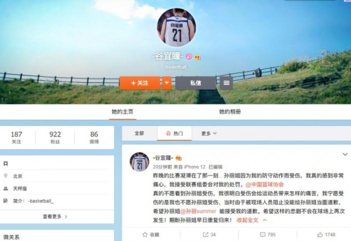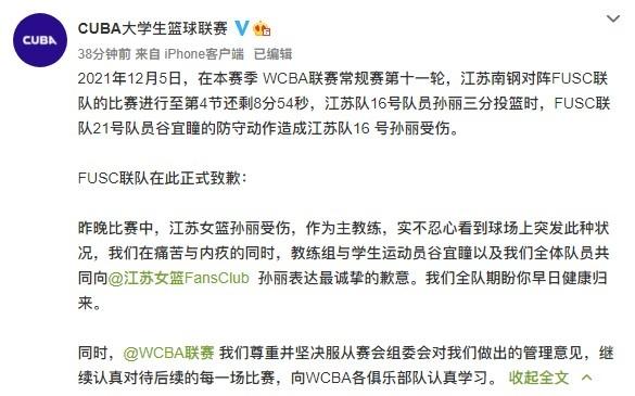随后大学生联赛官方进行道歉,谷宜瞳本人也在微博上进行道歉“昨晚的比赛凝滞在了那一刻…孙丽姐因为我的防守动作而受伤,我真的感到非常痛心,我接受联赛组委会对我的处罚。真的不愿看到孙丽姐受伤,我很明白受伤会给运动员带来怎样的痛苦,我宁愿受伤的是我也不愿孙丽姐受伤,当时由于被现场人员阻止没能给孙丽姐当面道歉,希望孙丽姐@孙丽summer 能接受我的道歉。”