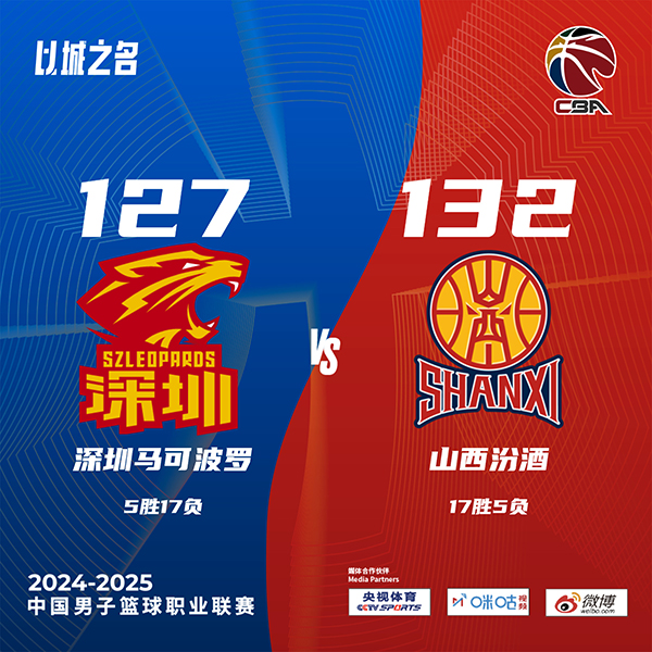 24直播网讯北京时间12月24日讯 CBA常规赛,深圳主场迎战山西,深圳目前5胜16负排在第18位,山西则是16胜5负高居积分榜次席,本场比赛,山西外援古德温被禁赛。比赛开始,双方上来都迅速进入状态,并展开对攻战,随后威姆斯有攻有传,联手汤普森助队一度领先到双位数,但山西节末发力追到差3分,次节周鹏发力,单节连中3记三分带队重新拉开比分,但张宁站出来外线强势回应3记三分止血,原帅半场结束之前的三分再进直接反超2分。下半场,迪亚洛接连单打帮助山西拉开比分,但周鹏还能扔进三分,随后周鹏三分被莱蒙垫脚受伤下场,但约翰逊接连中远投轰出9-0反超6分,末节双方继续拉锯战,周鹏重新披挂上阵,山西很快犯满,深圳保持领先,迪亚洛违体犯规后深圳领先到8分,但深圳连续失误,张宁一攻一传拖入加时。加时赛,迪亚洛成为主攻点帮助球队反超3分,贾明儒也接连贡献得分,迪亚洛6犯毕业,周鹏关键绝平三分不中,最终山西加时132-127力克深圳。
