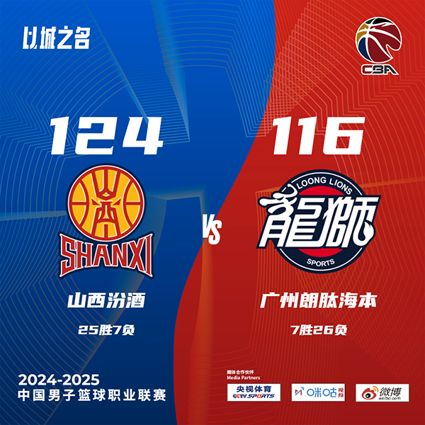 24直播网讯 北京时间1月20日讯 CBA常规赛,山西主场迎战广州,山西目前3连胜后24胜7负后排在第3位,广州则是4连败后7胜25负排在第18位。本场比赛,山西外援迪亚洛缺阵。山西上来就打出7-0开局,郭艾伦有攻有传带队迅速回应10-0反超,随后双方展开拉锯战,山西接连三分,郭艾伦连续助攻回应,首节广州领先4分,次节古德温带领球队追分,而广州外援麦考尔和道格拉斯能联手回应,郭艾伦继续串联的情况下,里突外投连续取分,双方比分持续胶着。下半场,双方继续胶着拉锯战,场上哨声频响两队很快都犯满,末段双方对攻,原帅有攻有传带队领先8分,末节原帅上来又是接连三分拉开双位数领先,郭艾伦有攻有传带队咬住比分,但张宁接连突破取分,古德温压哨三分杀死比赛,最终山西124-116力克广州,拿到4连胜同时送对手5连败。