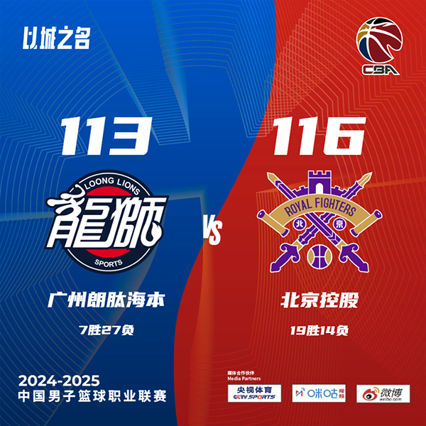 24直播网讯 北京时间1月22日讯 CBA常规赛激战正酣,广州主场迎战北控,广州遭遇5连败,7胜26负仅列联赛倒数第三,北控苦吞3连败,18胜14负排在联赛第10位。此役一上来双方便陷入缠斗,郭艾伦延续状态接连取分,萨林杰联手里勒强势回应,双方你来我往比分紧咬,首节结束时北控领先1分,次节回来,两队延续火力继续对攻,北控内外结合一度拉开比分,但郭艾伦连投带罚率队迅速回应,末段朱松玮连续取分,半场战罢,北控确立9分优势。易边再战后郭艾伦状态炸裂单节独得14分,无奈北控总能给予回应,三节结束后北控依然领先3分,末节决战,郭艾伦连投带传率队一波8-0一举反超,决胜时刻朱松玮连拿5分,郭艾伦两罚全中砍下40+,但张帆关键两罚稳稳命中,麦考尔绝平三分未果,最终北控116-113险胜对手终结3连败,同时送给广州6连败。