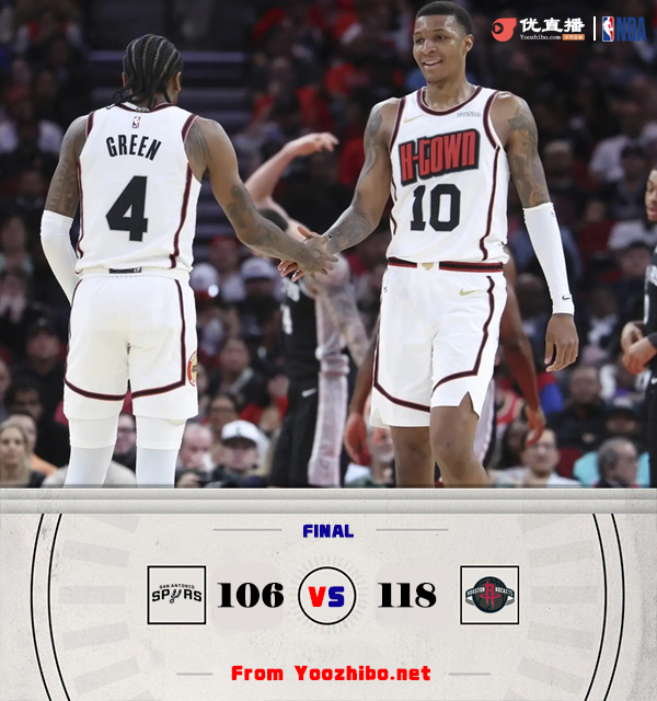 24直播网讯北京时间2月27日讯 NBA常规赛,火箭主场迎战马刺。火箭36胜22负排在西部第5,马刺24胜32负排在西部倒数第3。比赛开始,火箭率先发力,狄龙连中三分将分差拉开到两位数,马刺迟迟找不到感觉,火箭多点开花不断拉大分差,次节泰特三分一度帮助球队将优势扩大到20分,马刺连投带罚止住颓势,杰夫-格林连续拿分,半场战罢火箭64-46领先马刺。易边再战,火箭延续火力继续扩大优势,阿门连续补篮得手后三分也有,马刺连投带罚苦苦支撑,末节火箭稳扎稳打保持优势,马刺苦苦追赶无奈之前挖坑太大。最终,火箭118-106击败马刺,主场过关。