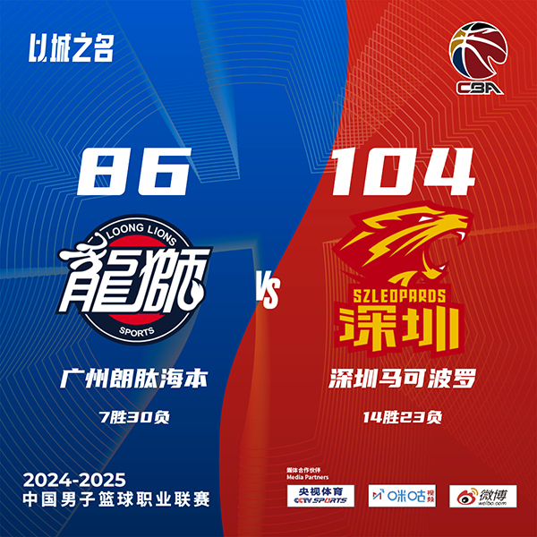 24直播网讯北京时间3月8日中国男子篮球职业联赛 常规赛,广州朗肽海本对阵深圳马可波罗。半场广州42-55深圳,最终广州86-104深圳。广州朗肽海本张兴亮16分4板3助,袁照耀12分5板1助;深圳马可波罗马凯尔-约翰逊24分4板9助,贺希宁23分4助。