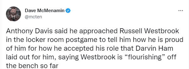 对于威少替补出战,浓眉赛后透露:我在更衣室找到威少,并告诉他,我为他接受了哈姆为他安排的角色而感到骄傲,希望他坚持下去。他过去两场的表现不可思议;威少从替补席站出来,展现了良好的势头,他为球队做出了牺牲。