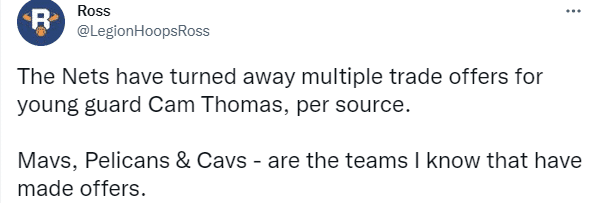 据美媒Legion Hoops报道,篮网已经拒绝多支球队对后卫卡梅隆-托马斯的交易报价;这些球队中包括了独行侠、鹈鹕与骑士。