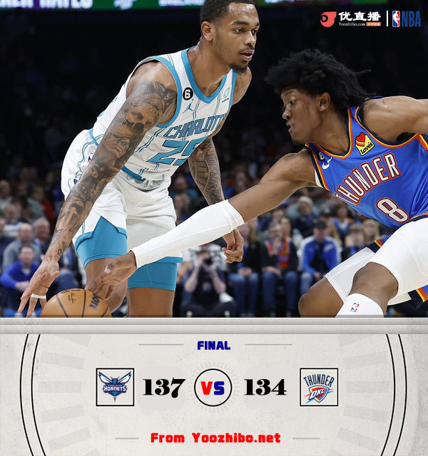 24直播网3月29日讯 NBA常规赛继续进行,雷霆坐镇主场迎战黄蜂,此前雷霆37胜38负位列西部第十,黄蜂则是25胜51负排名东部第十四。本场亚历山大缺阵。比赛开局,缺少主将的雷霆进攻效率不高,与黄蜂陷入拉锯战,两队交替领先。次节雷霆找到进攻状态,杰伦-威廉姆斯连续杀伤禁区,单节砍下17分,带领球队单节得到45分,一举领先到两位数,半场结束雷霆68-57领先。易边再战,黄蜂找到进攻状态,紧咬比分,分差在十分上下浮动,雷霆领先6分进入第四节。末节场上形势风云突变,华盛顿突然爆发,予取予求单节砍下22分,帮助黄蜂反超并一度领先到13分,但雷霆还是在终场前将比分追上,理查兹完成关键补扣,雷霆连续两罚一中错失扳平机会,最终黄蜂137-134逆转战胜雷霆,取得三连胜。