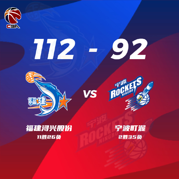 24直播网3月19日讯 CBA常规赛继续进行,福建对阵宁波,此前福建10胜26负排名联赛第17,宁波则是在一波14连败后2胜34负继续排名联赛垫底。比赛开局,宁波进攻状态不佳,福建众人发力很快领先到两位数,此后分差在十分上下浮动,福建领先9分进入次节。第二节宁波进攻端回暖,逐渐蚕食分差并一度反超比分,半场结束福建52-51仅领先1分。易边再战,宁波再次陷入得分荒,福建稳扎稳打重新拉开比分,领先17分进入第四节。末节回到场上,福建将分差拉开到20分,比赛逐渐失去悬念,最终福建112-92大胜宁波,送对手15连败。