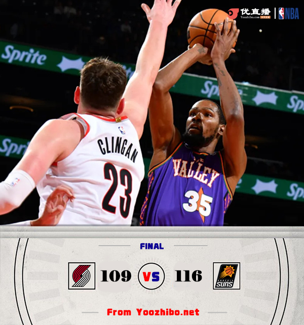 24直播网讯北京时间12月16日讯 NBA常规赛,开拓者对阵太阳,开拓者近况不加遭遇5连败,太阳上场比赛在杜兰特复出的帮助下力克爵士。开场后布克三分先声夺人,随后杜兰特接连砍分帮助太阳建立领先,开拓者多点开花紧追不舍,但第一节尾声太阳外线又是一波三分将分差拉大到两位数。第二节上来开拓者内外开花一路将分差追到只差2分,克林根内线连续上演暴扣,布克和奥尼尔先后命中三分为太阳止血。易边再战,开拓者延续反扑势头,上来就是一波11-0的攻势反超比分,布克内突外投连连砍分帮助太阳夺回领先。第四节太阳多点开花再度掀起攻势将分差拉大到两位数,虽然开拓者最后时刻一度又缩小分差,但时间所剩无几,最终太阳116-109送开拓者6连败。
