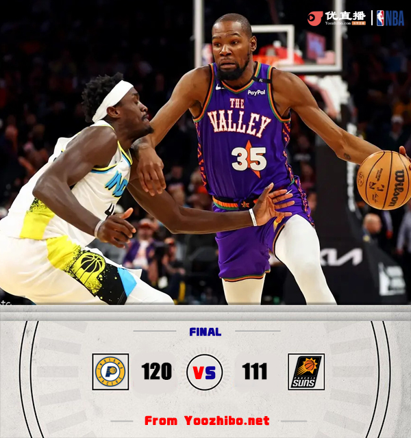 24直播网讯 北京时间12月20日讯 NBA常规赛,太阳今日迎战步行者,两队近来状态都可以,均是取得两连胜,此役比尔可以出战,内史密斯缺战。比赛上来,太阳率先进入状态取得领先,但随后他们陷入到近四分钟的得分荒,步行者趁势轰出一波14-0的攻势完成反超,之后的比赛太阳虽然一直紧咬比分却始终无法重夺领先,半场结束时步行者仍领先1分;下半场回来,步行者重新找到节奏,进攻端势如破竹单节再轰37分,分差也是拉开到了十分以上,对于太阳更为不利的是布克因腹股沟伤势提前退赛,末节步行者也没有再给对手任何机会,即便是杜兰特连续砍分也无济于事,最终步行者轻取太阳,迎来三连胜的同时也终结了后者的连胜。