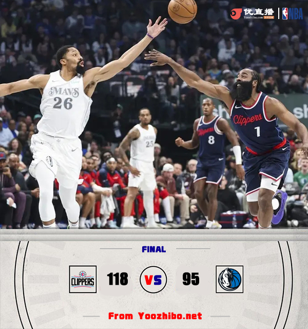 24直播网讯 北京时间12月20日讯 NBA常规赛,快船客场挑战独行侠。快船15胜12负排西部第9,独行侠17胜9负暂列西部第4。比赛开始,双方开场势均力敌,比分始终紧咬,独行侠内外开花取得8分优势,诺曼-鲍威尔连中三分独得8分带队顽强咬住,哈登和小德里克-琼斯相继命中三分,半场战罢快船50-49领先独行侠。易边再战,邓恩二级恶意犯规被直接驱逐,但快船持续发力将分差拉开到两位数,末节双方围绕10分分差展开拉锯战,快船连中三分扩大将分差拉开到20分以上,独行侠大势已去无力回天。最终,快船118-95击败独行侠,客场过关。