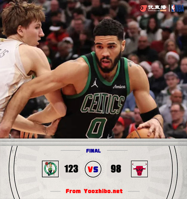 24直播网讯 北京时间12月22日讯 NBA常规赛激战正酣,凯尔特人前往客场再战公牛,上场公牛客场击败对手迎来三连胜,凯尔特人主帅马祖拉赛后不满判罚怒喷主裁被罚款3.5万美元。此役一上来双方便陷入缠斗,布朗率先发力不断取分,公牛内外结合及时回应,两队你来我往比分始终紧咬,首节战罢双方战成28平,次节回来,公牛开局进攻出现停滞,凯尔特人持续发力,并在末段轰出10-0攻击波拉开比分,半场战罢,凯尔特人确立7分优势。易边再战后塔图姆连中三分狂揽18分,凯尔特人延续火力将分差越拉越大,三节结束后凯尔特人已经领先16分,末节上来,公牛进攻滞涩追分乏力,塔图姆手感滚烫提前终结悬念,双方早早换上替补阵容,最终凯尔特人123-98大胜公牛成功复仇。