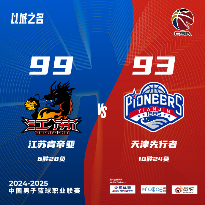 24直播网1月21日讯 CBA常规赛,江苏对阵天津,江苏最近遭遇6连败,天津上场比赛力克宁波。开场后汤普森就在内线表现强势帮助江苏取得领先,大卫-詹姆斯被压制表现并不理想,不过天津外线手感不错咬住比分,尤其是林庭谦首节独中4记三分。第二节天津上来一波11-4的攻势反超比分,杰克逊内突外投拿到5分为江苏稳住阵脚,随后场上比分交替上升,李承耀压哨补篮命中帮助江苏半场结束时守住1分优势。易边再战,江苏在第三节后半段通过不断冲击内线打出高潮建立起领先,最后一节天津进攻端依旧打得十分艰难,大卫-詹姆斯依旧表现不佳还吃到技术犯规,江苏将分差保持在两位数,林庭谦和郑昊燃最后连续抢投三分命中但也未能回天,最终江苏99-93击败天津结束6连败。