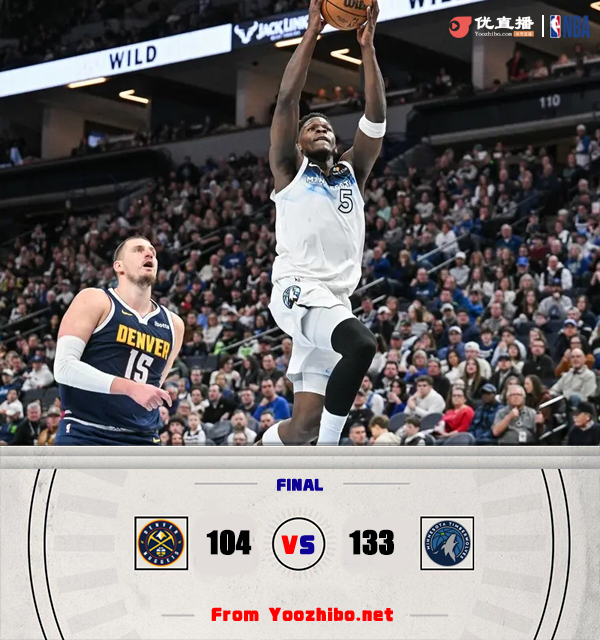 24直播网讯 北京时间1月26日讯 NBA常规赛,森林狼主场迎战掘金,森林狼目前23胜21负西部第8位,掘金则是近4连胜后28胜16负西部第4位。比赛开始,戈贝尔上来很是兴奋,进攻端连续强打加送妙传带队建立主动权,随后约基奇里突外投单节13分带队止血,但森林狼多点开花首节轰下40分领先9分,次节小乔丹接连前场篮板,穆雷和威少联手追分,森林狼还是能多人回应半场领先双位数。下半场,掘金防守端依然提不起劲儿,爱德华兹里突外投单节轰下16分,森林狼继续多点开花领先到20分以上,末节掘金进攻端断电,打了5分钟仅得2分,森林狼牢牢保持住20分以上领先,最终森林狼133-104大胜掘金,终结对手4连胜。