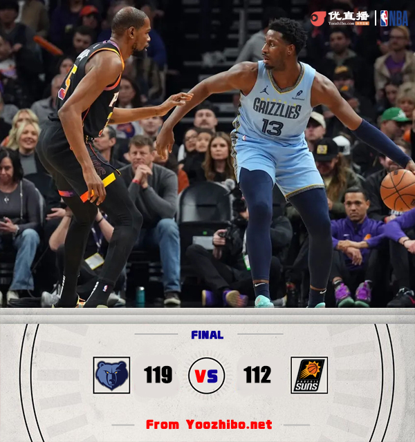 24直播网2月12日讯 NBA常规赛今日继续开打,太阳坐镇主场迎战灰熊。太阳近期状态再度回落,一度冲进西部前八的他们最近5场比赛输掉4场跌到西部第11位,不过本场比赛杜兰特伤愈回归;灰熊虽然在上一场输给雷霆但目前仍然排在西部第二位。首节之争灰熊反客为主早早进入状态,前期虽然优势不大但一直控制比赛,末段轮换阶段则接管比赛,他们连着4记三分送上一波18-7的攻势一举拉开两位数分差;次节杜兰特虽然砍下17分但球队防守端才是症结所在,灰熊虽然没有绝对高分但多点开花无视防守稳定输出,他们半场送出18次助攻足见进攻端的流畅度并带着12分领先进入下半场。休息归来灰熊前期一直占据上风一度拉开18分的领先,不过太阳在后半段逐渐起势蚕食分差,杜兰特第三节命中两记罚球达成个人生涯第三万分里程碑;末节决胜太阳两次追至4分但都没能再进一步,灰熊则连续关键球得分顶住压力并守住胜利。最终,灰熊客场击败太阳拿下比赛。