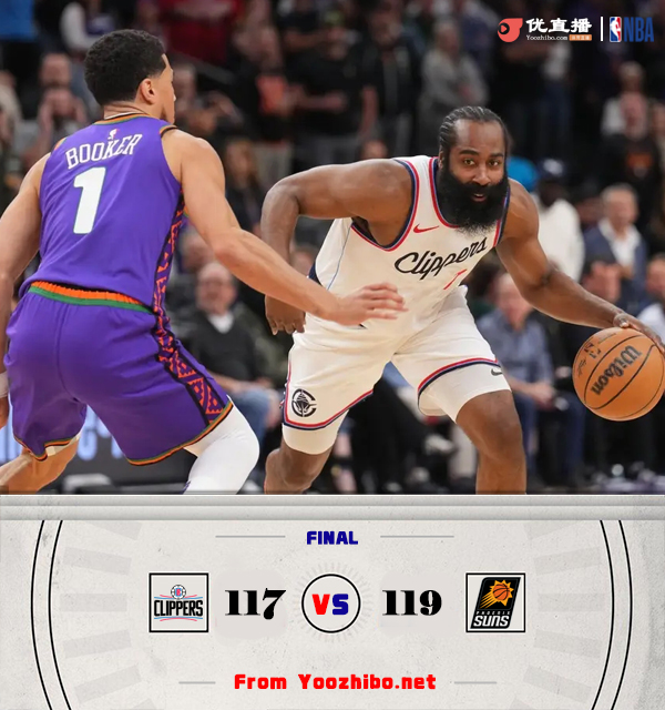 24直播网讯3月5日讯 NBA常规赛,快船对阵太阳,快船最近2负湖人已经掉到西部第八,本场比赛鲍威尔缺阵,太阳最近10场输了8场也是形势危险。开场后快船内外开花抢占先机,莱昂纳德开场进攻欲望强烈,普拉姆利替补登场后表现活跃,太阳在首节结束前掀起反扑将比分反超。第二节上来快船先声夺人打出攻势夺回领先,随后快船外线又是一阵三分雨将分差拉大, 祖巴茨在内线也多次吃饼拿分,太阳进攻端表现不佳,快船单节轰下41分净胜22分。易边再战,祖巴茨在内线依旧强势接连打进,场上分差拉大到20分,琼斯投进三分止血,但莱昂纳德手感火热帮助快船始终保持巨大优势。最后一节回来杜兰特连得10分帮助太阳打回悬念,虽然祖巴茨在篮下依旧神勇,但太阳反扑势头凶猛在杜兰特的带领下反超比分。布克关键两罚不中,太阳采用点球战术,哈登第二罚故意不中,快船拿到前场篮板但最后一攻不中,最终太阳119-117大逆转送给快船3连败,本赛季太阳实现横扫快船。
