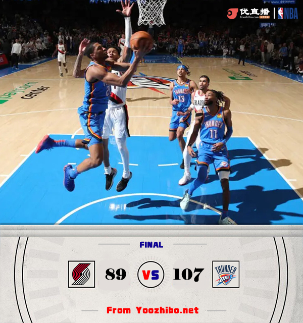 24直播网讯北京时间3月8日讯 NBA常规赛,雷霆对阵开拓者,雷霆最近5连胜依旧在西部遥遥领先,本场比赛亚历山大、杰伦威和霍姆格伦都缺阵,开拓者上场比赛遭遇失利,还是排在西部第十二。开场后雷霆外线手感不错频频命中三分,在第一节中段他们打出攻势取得领先,随后开拓者也用三分回击缩小分差。第二节上来西蒙斯率先发力带领开拓者反超比分,雷霆通过加强防守多次造成开拓者失误打出反击,并且外线续上火力重新夺回领先,第二节尾声开拓者陷入得分荒,半场过后雷霆领先到18分。易边再战,雷霆上来延续攻势将分差拉大到20分开外,亨德森突然爆发带领开拓者一路追到只差5分。第四节雷霆及时稳住局面,两队围绕10分拉锯,开拓始终无法追上比分,最终雷霆107-89击败开拓者取得6连胜,开拓者遭遇2连败。