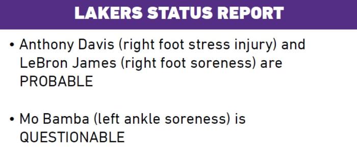 今年季后赛至今,詹姆斯场均拿到22.8分10.1篮板5助攻1.3盖帽湖勇G6,詹姆斯有望火力全开轰下30+;顺便提一下,浓眉没有遭遇脑震荡,湖人官宣G6伤情报告,詹姆斯(右脚酸痛)和浓眉(右脚伤病)大概率出战,班巴出战成疑,预计詹眉都会出战。