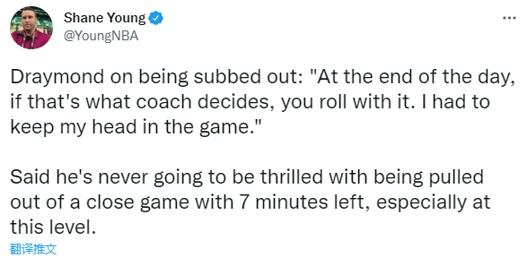 赛后谈到末节被弃用,表示:在这样一场非赢不可的比赛中,在第四节还剩7分钟时被换下,我肯定不会因此感到兴奋。我也不会坐在那里装出一副我很兴奋的样子,因为我是一个竞争者;但说到底,归根结底,这是教练的决定,你要接受它。