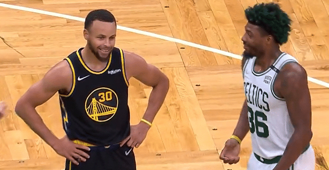 第三节初期,斯玛特在弧顶持球准备出手,库里从身后犯规,之后斯玛特出手,裁判福斯特给了库里本场比赛个人的第4次犯规,同时还示意是三分球犯规,也就是说斯玛特获得了3次罚球的机会。库里摇头表示不满,这次的犯规是在斯玛特出手之前,库里伸手之后,斯玛特才做出了投篮的动作,而并非库里影响了斯玛特的投篮,所以也引发了争议。