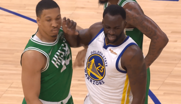 上半场快结束时,格林外线对杰伦-布朗犯规,格林倒地时把脚放在布朗的脑袋上并且从背后推了一把布朗,两人发生冲突吵起来,对此裁判仅仅吹罚普通犯规,没有技犯也没有恶犯,格林逃过一劫。