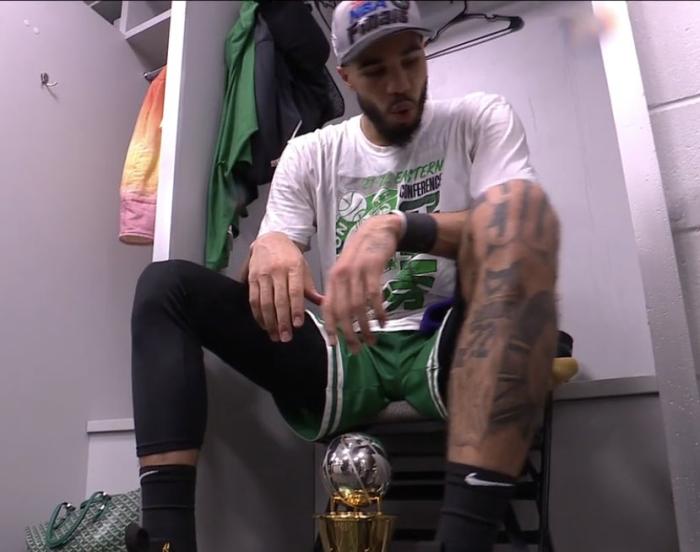 在东部冠军大合影中,塔图姆拿着东决MVP奖杯,蹲在前排满脸笑容十分开心;在东决MVP票选中,塔图姆获得8票,巴特勒获得1票,塔图姆几乎全票夺得拉里-伯德奖杯。