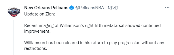 24直播网05月27日讯 ,新奥尔良鹈鹕官方宣布锡安的伤势已经无碍,解除活动限制并完全恢复篮球相关的活动,官方声明:最近的影像显示,锡安右脚第五跖骨的状况持续改善,他已经可以没有任何限制地重返球场。