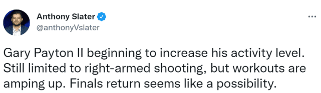 除了波特,小佩顿也将继续伤停。勇士记者晒出了小佩顿的最新训练视频,他已经能进行更多,强度更大的训练,小佩顿秀了两记扣篮,左手也可以参与合球,但还有所限制。斯雷特表示小佩顿总决赛期间回归似乎是可能的。