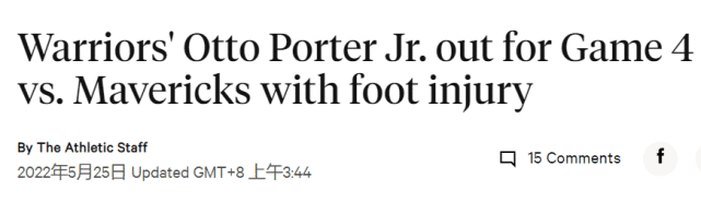 24直播网05月25日讯 勇士官方确认,波特因左脚伤势将错过今天的西决G4。目前,勇士3-0领先独行侠。小佩顿的恢复又有新进展,有望在总决赛期间复出。科尔在训练采访中称赞库里,认为他的状态比联盟里任何人的都好。