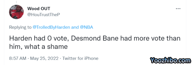 有球迷调侃哈登:贝恩的票数都比你多。灰熊的贝恩在今年的最佳阵容投票中获得了一张第三阵容的票数,得到1分。另外,兼职作战的欧文都得到1票。