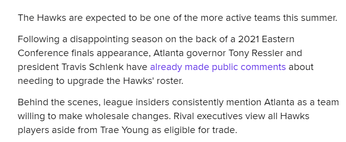 去年夏天,23岁特雷-杨和老鹰达成5年1.72亿美元的续约合同,是老鹰队的绝对核心;如今名记曝老鹰全队仅特雷-杨一人是非卖品,其他球员均可交易。