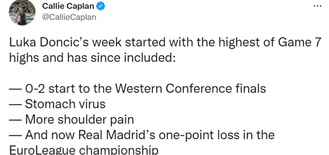独行侠记者Callie Caplan写道:“东契奇在抢七胜出后遭遇了这些:1. 西决0-2落后;2.肠胃炎;3.更多的肩膀疼痛;4.现在皇马(东契奇老东家)在冠军争夺战中一分惜败。”遭遇4大打击的东契奇,能够率队在G3扳回一城?让我们拭目以待。