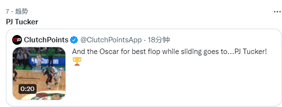 美媒CLutch Points转发塔克夸张假摔,并且配文写道:PJ-塔克该获得奥斯卡最佳假摔奖;还有美媒表示塔克假摔造塔图姆进攻犯规是季后赛最令人尴尬的事情。