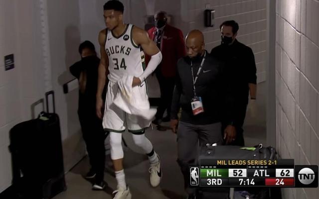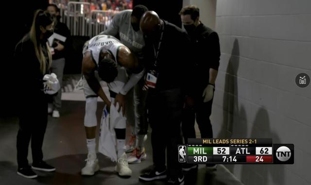 比赛进行到第三节还剩下7分14秒的时候,卡佩拉空接,字母哥试图封盖,但是或许是因为发力过猛,字母哥在落地的时候左膝扭伤,角度呈60度,随后字母哥倒地不起,表情非常的痛苦,随后字母哥也是直接被送回了更衣室接受治疗,目前伤病情况还没有进一步更新。