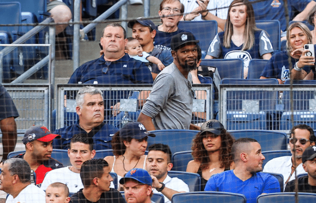 没有了嘴仗可打,杜兰特也回归到了正常的生活。6月29日,美国媒体报道,杜兰特出现在了MLB联赛纽约扬基VS洛杉矶天使的比赛中。不过和来看比赛的J罗等人身边都陪伴着美女不同,杜兰特的身边依旧只有一个光头经纪人克莱曼陪同。