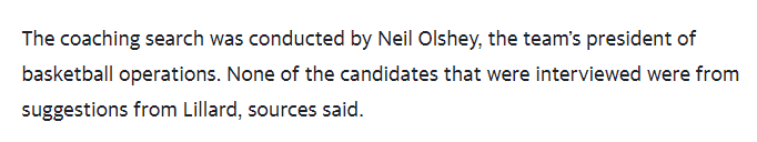 名记海耶斯还透露利拉德不满的最大原因:选择教练是由球队篮球业务总裁尼尔-奥尔谢决定的;所有接受面试的教练候选人都不是来自利拉德的建议。