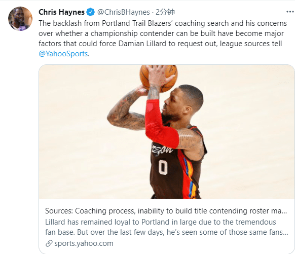 海耶斯表示由于拥有庞大的球迷基础,利拉德一直忠诚于波特兰。可是,在过去几天里,利拉德在社交媒体上看到了一些同样的粉丝在攻击他,因为他还没有完成一份悬而未决的教练工作;目前来看,快船助教比卢普斯将成为开拓者下一任主教练。