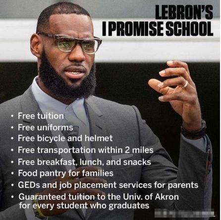 可是你要说詹姆斯抠门,这哥们对于家乡的孩子简直不要太大方。成名后的詹姆斯在家乡创立了“I PROMISE”学校,这个计划旨在帮助家庭困难的孩子完成学业,而这些孩子的食宿费用、学费等等费用,都将由詹姆斯买单,值得一提的是,这个学校共有1443名学生。