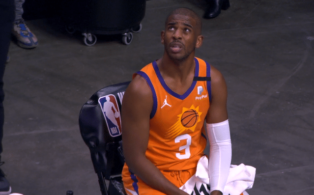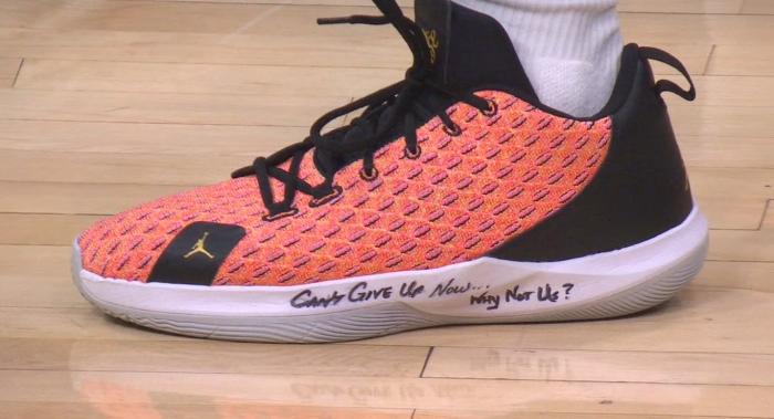 期间镜头拍到保罗的球鞋,上面印着“不能放弃,为什么不能是我们”,这就是保罗的决心,他想要带领太阳拿到西部冠军从而杀进总决赛。