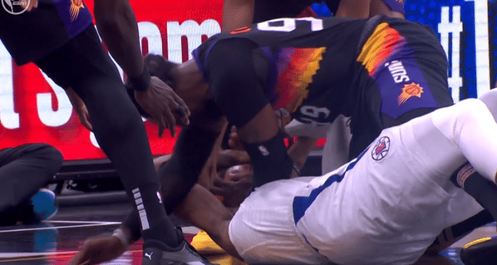 第一节6分多钟,乔治躺在地板上保护篮球,克劳德和佩恩两人都过来争抢球权,克劳德直接趴在乔治身上,最终裁判吹罚两人争球;如此画面凸显西决的激烈,不过看到如此画面,小莫里斯推了一把克劳德,对此裁判吹罚两人技犯。