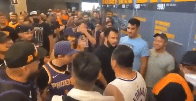 输球后的沮丧再加上听到太阳队球迷的狂言,一名身穿伦纳德球衣的快船球迷和这哥们发生了口角,随后这名快船球员一个横拳打在了太阳队球迷身上。