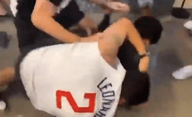 不过显然论到打架,代表伦纳德出赛的这哥们战斗力还是不行,他很快被这名太阳队球迷摁在地板上摩擦。看到自家球迷被打,又一名快船队的球迷加入战团,形成2打1的局面。