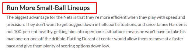 这似乎和第一项建议是矛盾的,但事实上又并非如此。小乔丹确实要回归轮换,但他不会打很长的时间,篮网仍要发挥球队速度和投篮准确度方面的优势。他们应该尽量避免打半场阵地,毕竟,哈登不是100%健康,让杜兰特更多出现在中锋位置上,可以提速篮网,给他们更充分的进攻选择。