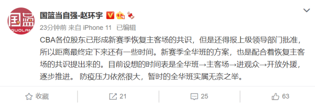 接下来就是看CBA股东投票表决了,然后体育总局审批,虽然官方文件还没下来,但据多位名记爆料这基本上是板上钉钉的事情了!媒体人赵环宇爆料“新赛季全华班的方案,也是配合着恢复主客场的共识提出来的。目前设想的时间表是全华班→主客场→进观众→开放外援,逐步推进。 防疫压力依然很大,暂时的全华班实属无奈之举。”