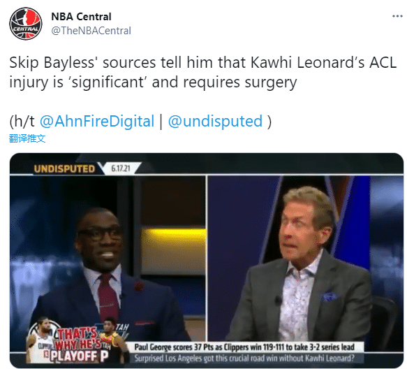 另外小卡膝伤不乐观,名嘴Skip Bayless在节目中透露:小卡十字韧带伤势很严重,他需要立即接受手术,肯定将缺席本赛季剩余的比赛;按照名嘴的爆料,小卡将因伤提前报销,真没想到伤势如此严重;哎,今年季后赛伤病太多,难道有人说最健康的球队将夺冠!