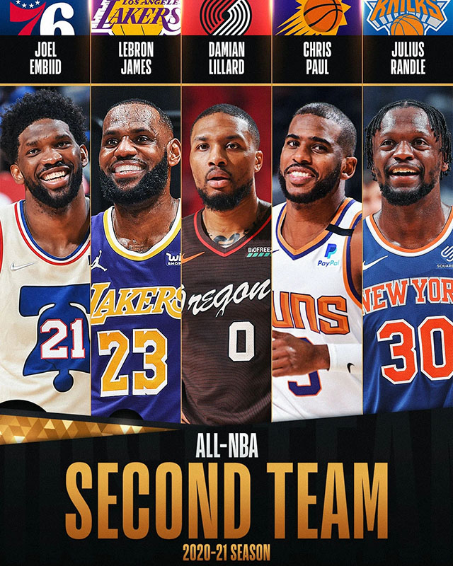 乔尔-恩比德(76人)、勒布朗-詹姆斯(湖人)、达米安-利拉德(开拓者)、克里斯-保罗(太阳)、朱利叶斯-兰德尔(尼克斯)。