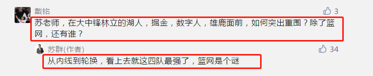 有球迷提问苏群老师,“苏老师,在大中锋林立的湖人,掘金,数字人和雄鹿面前,如何突出重围”。而苏群老师的回答很直接,从内线到轮换来看,这四队最强,篮网是个谜。