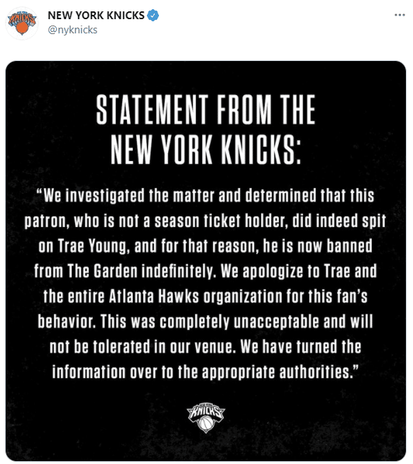 尼克斯球迷朝特雷杨吐痰,尼克斯官方已经向特雷杨和老鹰队道歉,并且无限期禁止这名球迷在麦迪逊花园球馆看比赛。