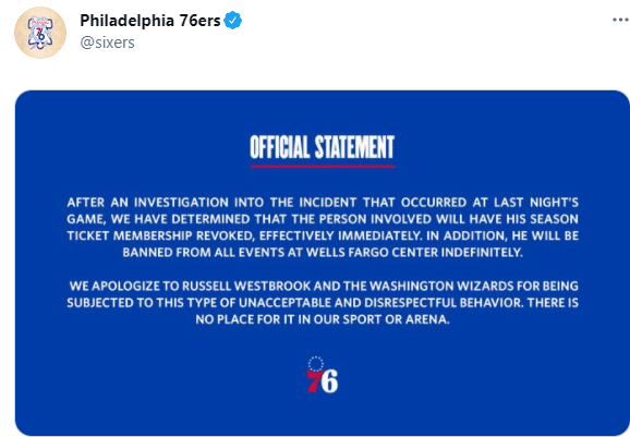 费城官方声明:对比赛中发生的意外进行调查后,我们决定立即撤销涉及该事件球迷的季票资格。此外他将被无限期禁止参与费城主场富国银行中心球馆的任何活动。