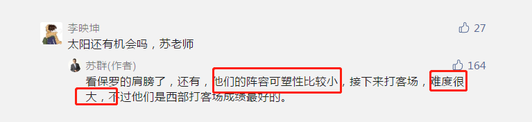 而对于太阳队,苏群表示,现在已经很难了。“他们的阵容可塑性比较小,接下来打客场,难度很大”。苏群老师如此评价太阳即将去斯台普斯中心挑战湖人,保罗的伤病是隐患,对于太阳来说,这轮系列赛极其艰难,晋级希望不是很大。