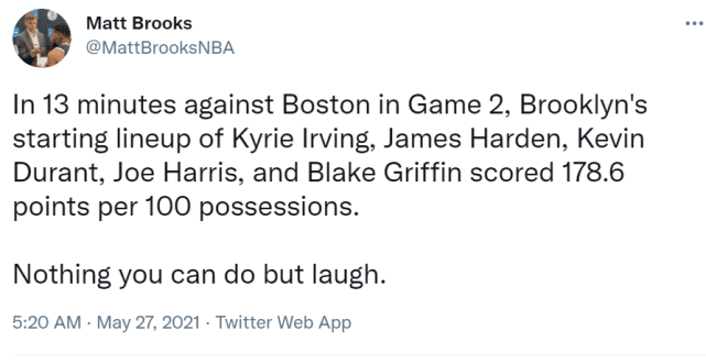 篮网的首发是三巨头加上哈里斯和格里芬,记者Matt Brooks在社媒上写道:“篮网这套首发在第二场一共使用13分钟,在这13分钟里,他们的进攻效率是百回合得到178.6分,你能做的只有大笑。”进攻是篮网的最强杀招,但强到这个份上,依然会让人有些吃惊。